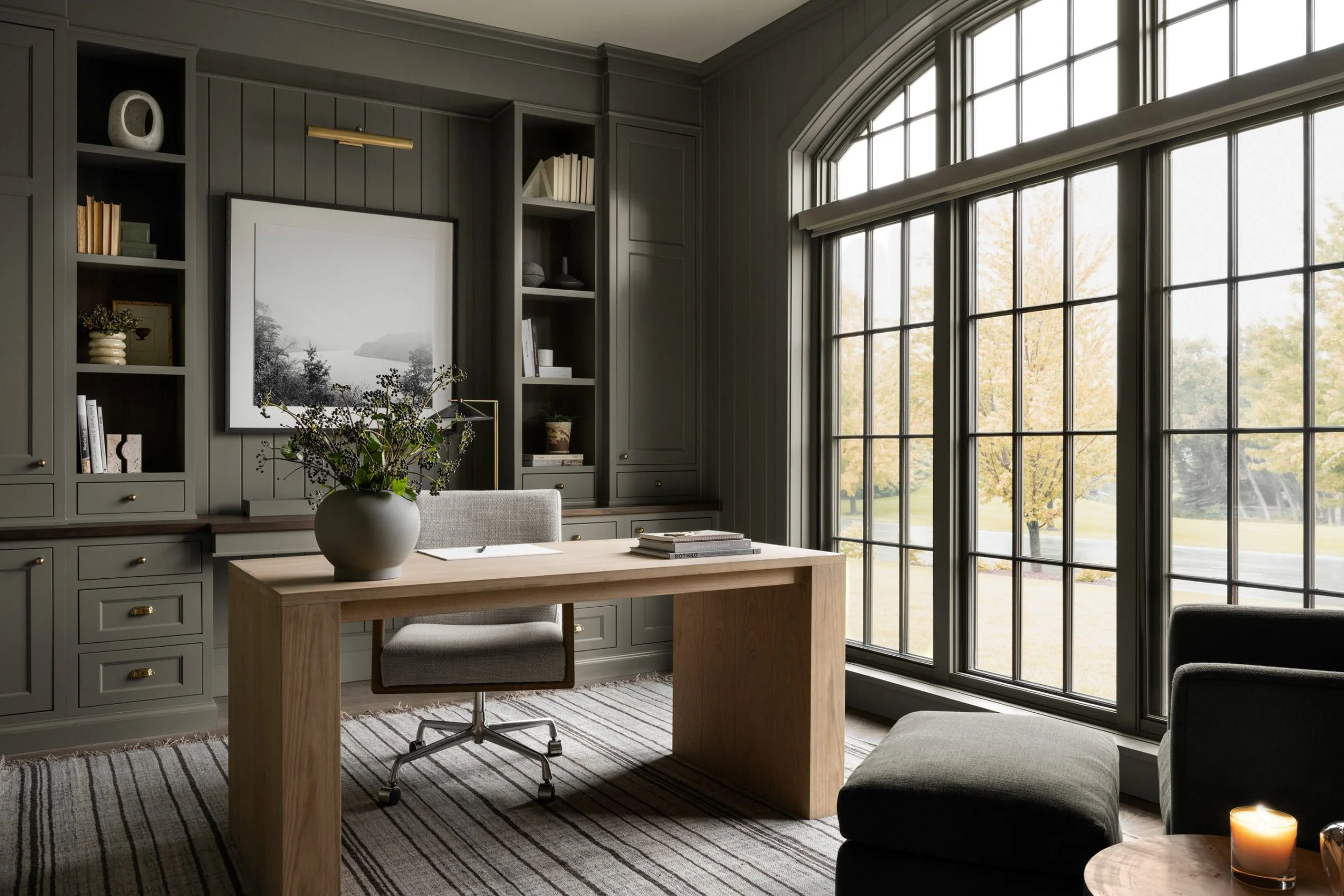 As for the design concept I have been dreaming of a moody office moment for when you first walk into our home. I looked at architectural details that I wanted to include from craftsman homes that I wanted to incorporate. Our home is a Cape Cod/ Craftsman look alike styled home, so I have slowly been trying to add more craftsman details to stay true to the exterior style of our home. I want this space to feel cozy and inviting, but yet unique from the rest of the house.